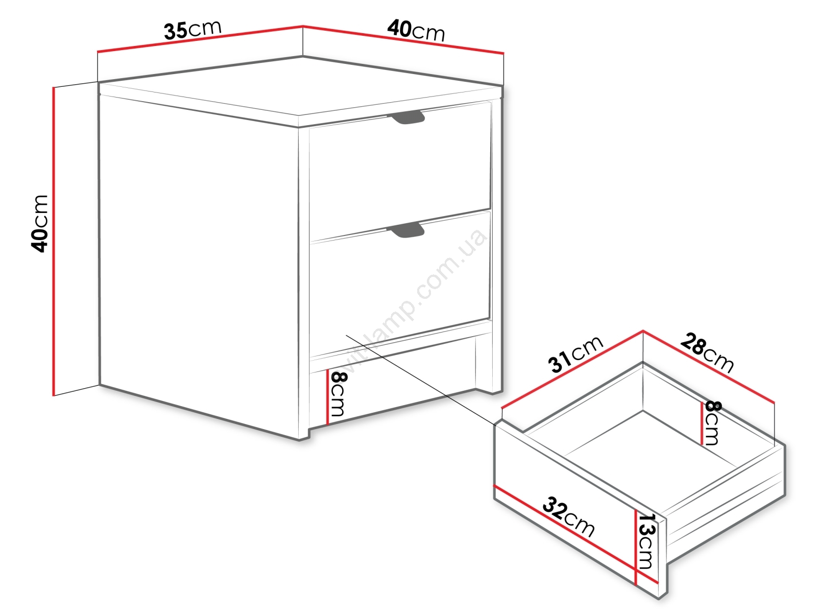 • Дві шухляди пропонують практичний простір для зберігання, тож ви зможете зручно тримати поруч із ліжком необхідні речі.