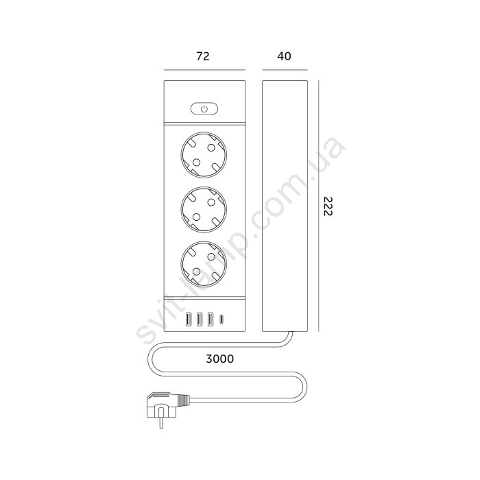 • Кількість розеток: 3 x 230 В, 3 x USB-A і 1 x USB-C.