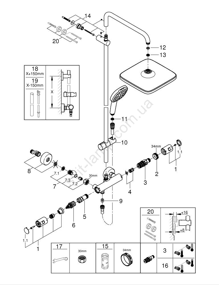 • Настінний термостатичний змішувач з функцією Aquadimmer забезпечує легке переключення між верхнім і ручним душем.