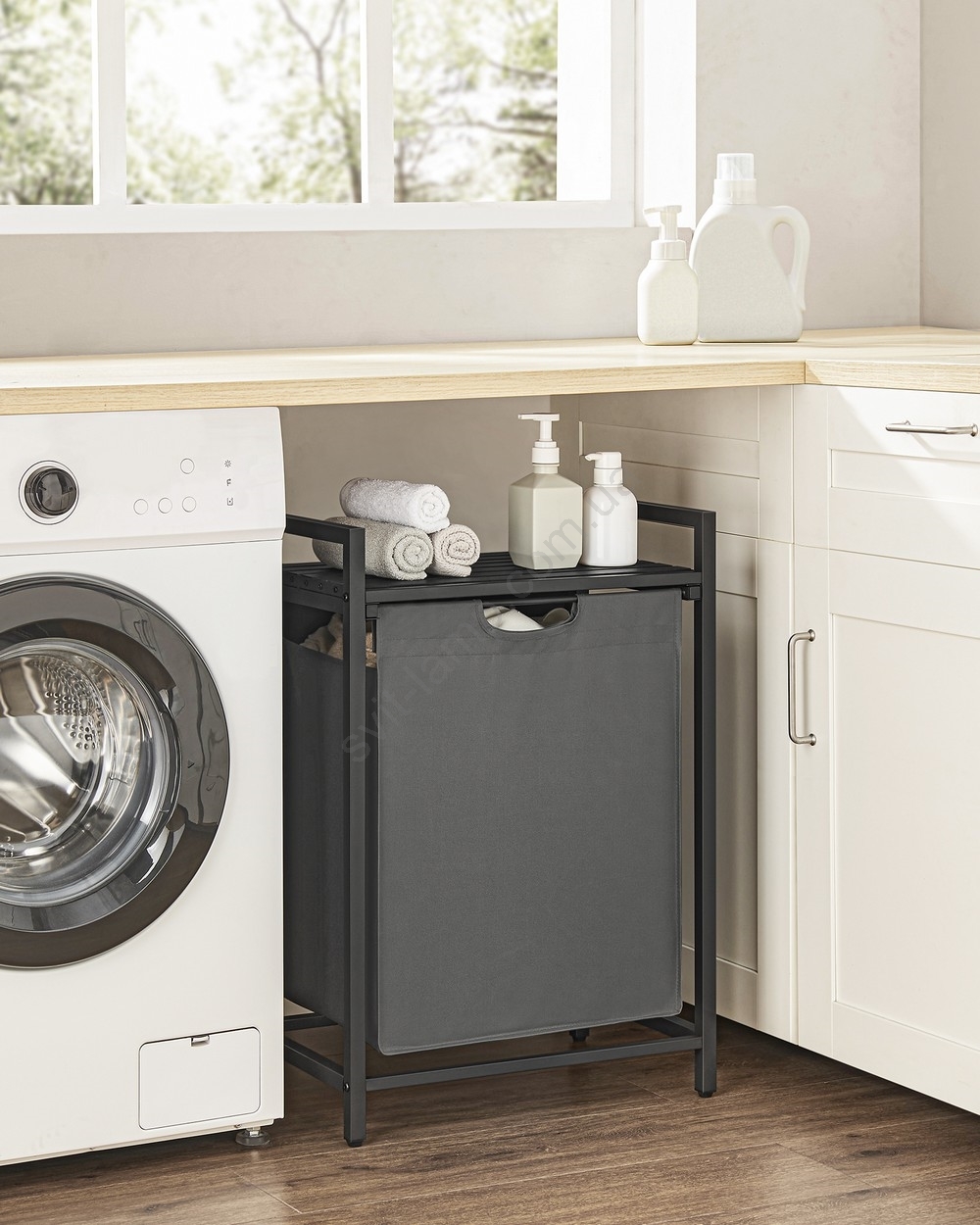 • 1 мішок, 1 полиця – Зберігайте білизну в текстильному мішку (65 л) і розміщуйте пральні засоби, кондиціонер для білизни та інші речі на полиці над ним.