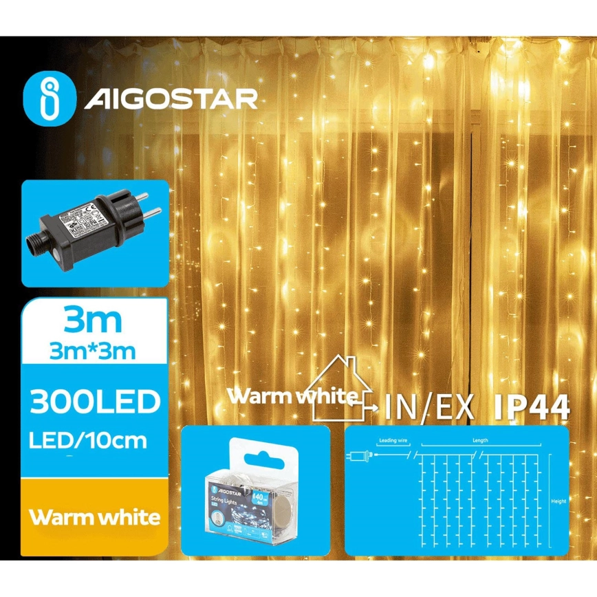 Aigostar - Светодиодная уличная рождественская гирлянда 300xLED/8 функций 6x3 м IP44 теплый белый
