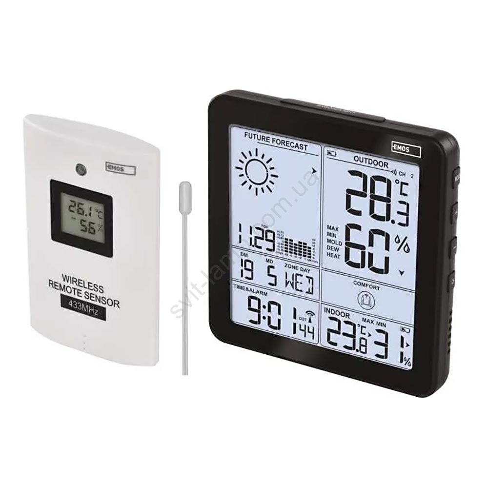 Отображает информацию: температуру в помещении и на улице, влажность в помещении и на улице, показания минимальной и максимальной температуры, прогноз погоды, время, дата и календарь.