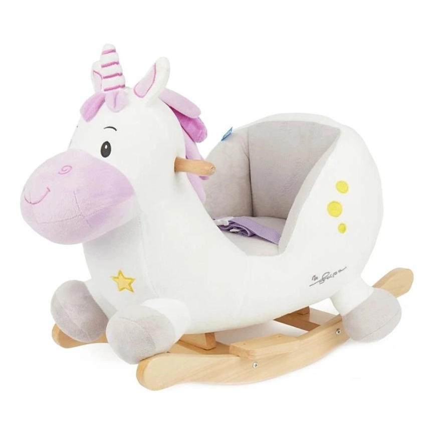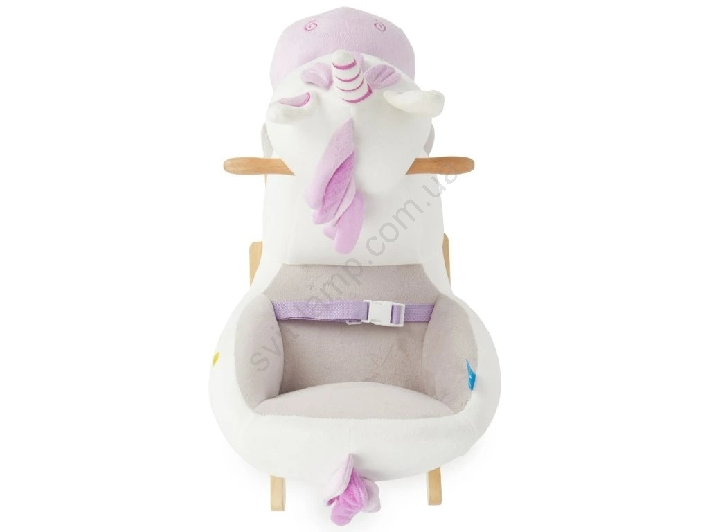 • Единорог оснащён мягким, удобно мягко обитым сиденьем с ремнём безопасности, обеспечивающим максимальный комфорт и защиту даже самым маленьким детям.