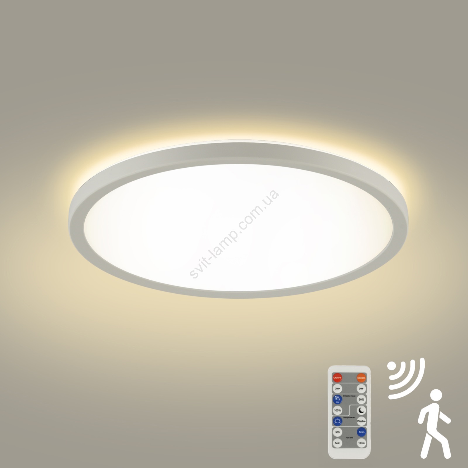 Светодиодный потолочный светильник с пультом дистанционного управления и датчиками движения и сумерек.