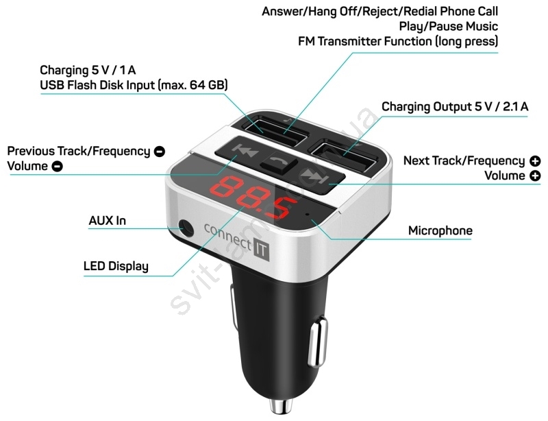 • FM-трансмиттер, объединяющий три устройства в одном — двухпортовое USB-зарядное устройство, беспроводную Bluetooth-гарнитуру и музыкальный плеер.