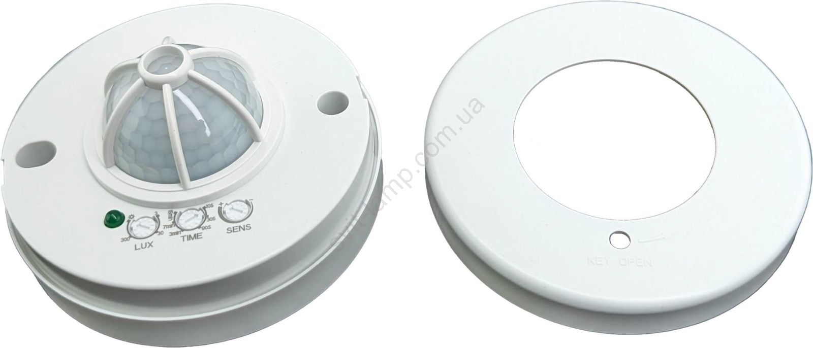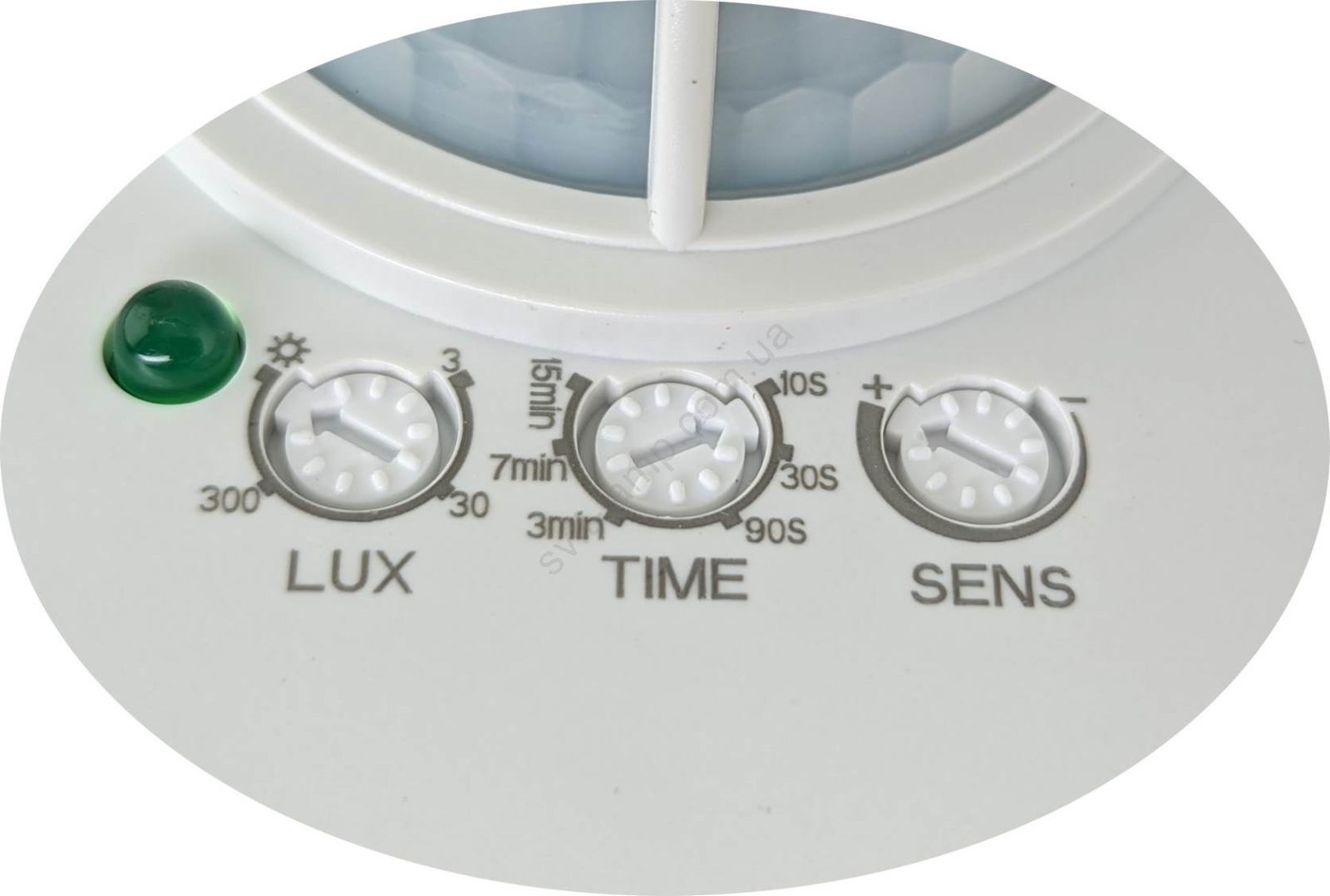 Регуляторы позволяют плавно настраивать: время работы (от 10 с до 15 мин), дальность обнаружения движения (от 3 до 6 м), датчик освещённости (от 3 до 2000 лк).