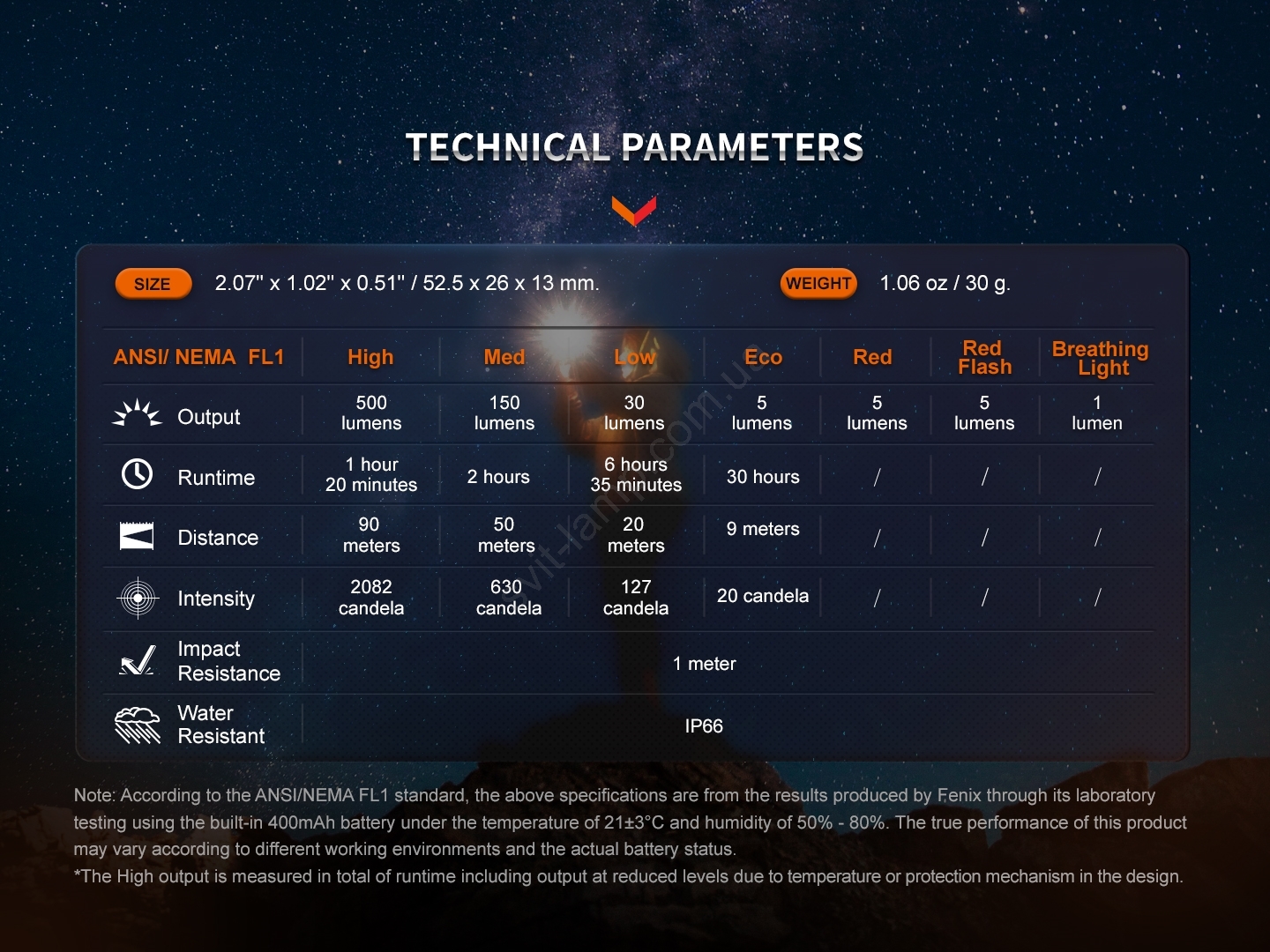 Несмотря на минимальные размеры и вес всего 30 грамм, он обеспечивает высокий световой поток до 500 люмен (ANSI).