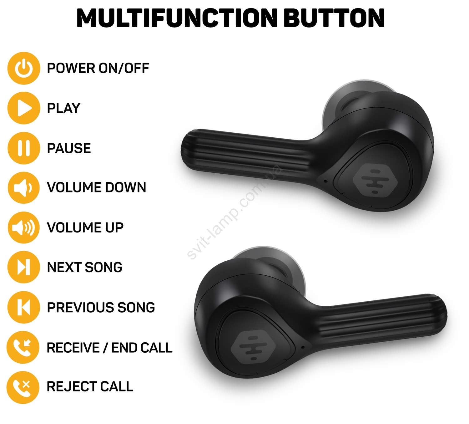 Многофункциональная сенсорная кнопка на каждом наушнике для комплексного управления (включение/выключение, сопряжение, пауза, воспроизведение, переключение треков, приём, завершение и отклонение звонков, управление голосовыми ассистентами Siri и Google).