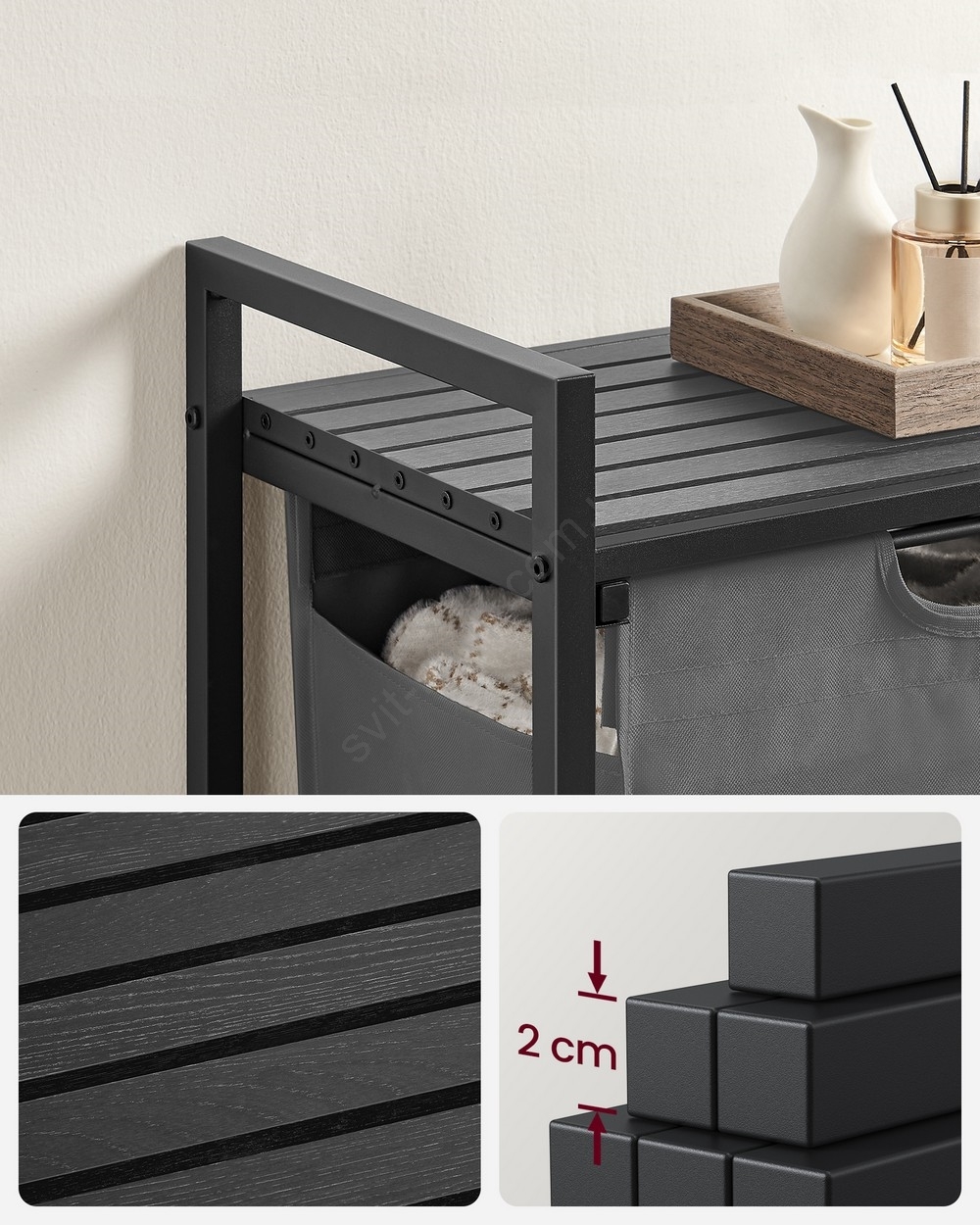 • 1 мешок, 1 полка – Сложите бельё в тканевый мешок (65 l) и разместите стиральные средства, кондиционер для белья и другие вещи на полке над ним.