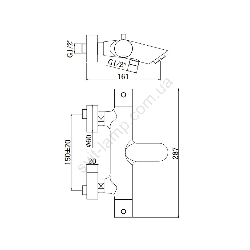 • Термостатический настенный смеситель для ванны с душевым комплектом.