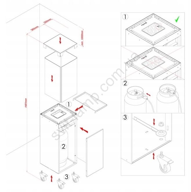 Встроенный отсек в нижней части легко вмещает газовый баллон весом 11 кг (не входит в комплект).