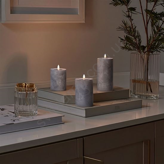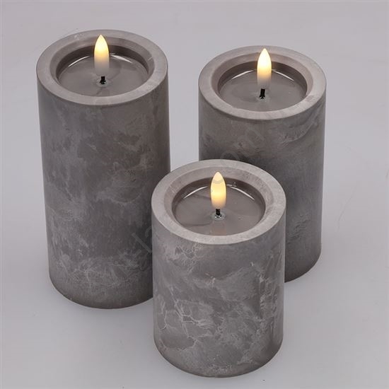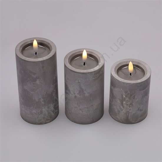 • Набор светодиодных свечей с естественным мерцанием пламени и серым мраморным декором.