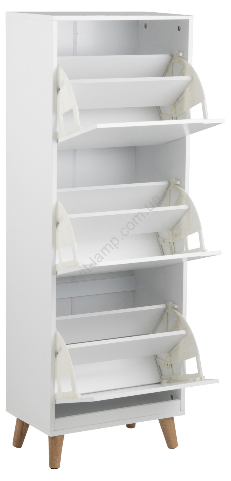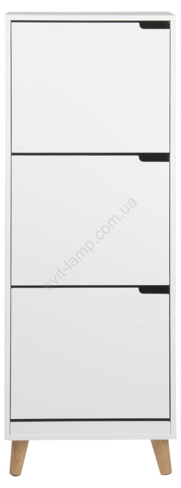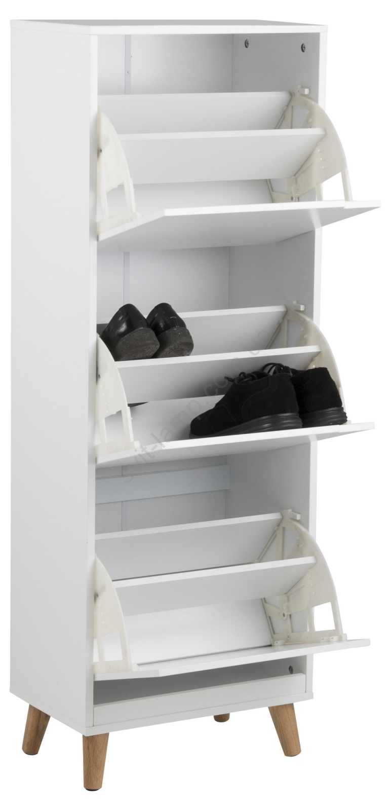 Обувница стоит на наклонных деревянных ножках, что придаёт ей лёгкий ретро-оттенок, уравновешивающий чёткие края прямоугольной верхней панели.