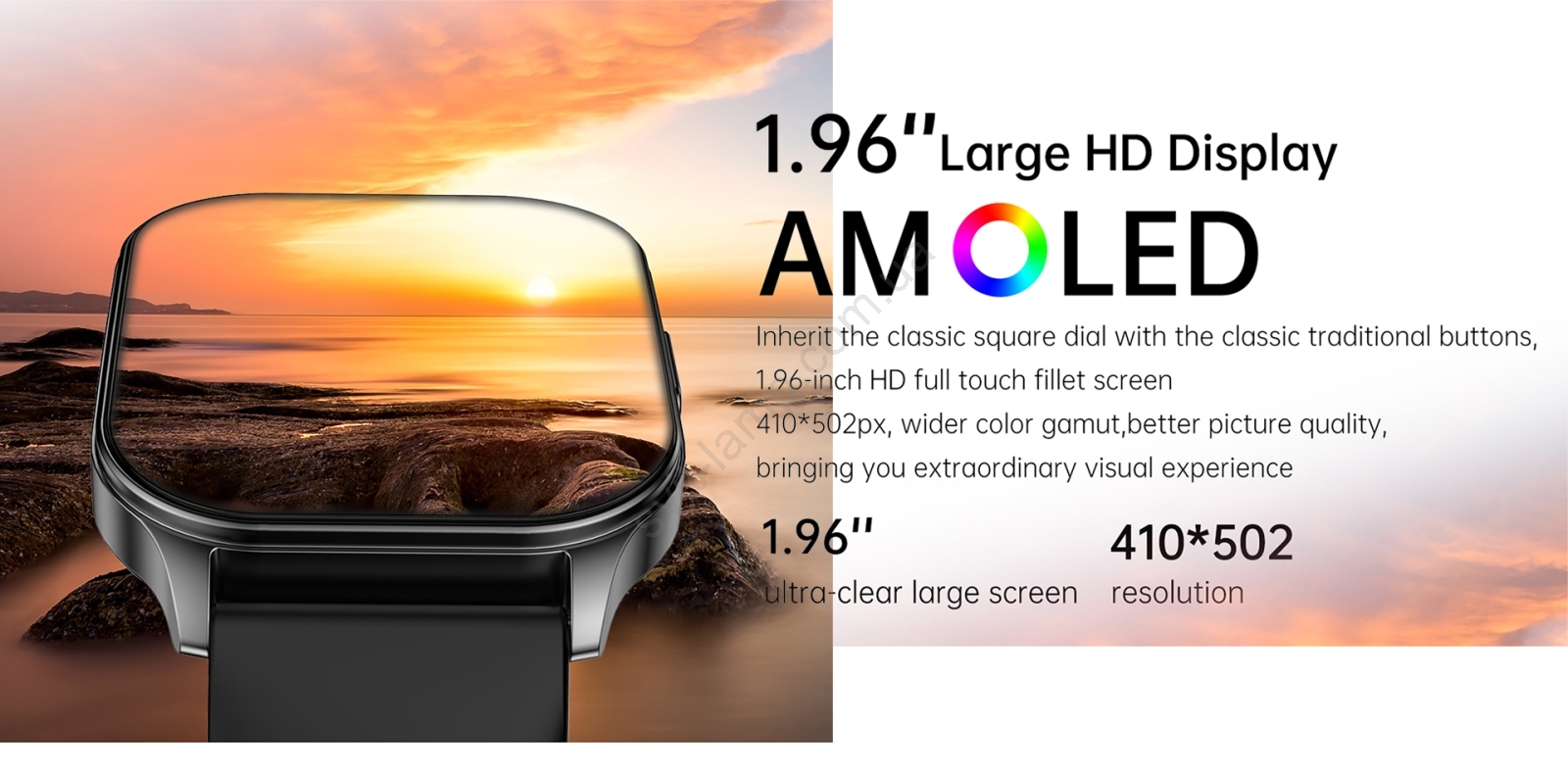 • Прямоугольный циферблат с классической кнопкой придаёт им элегантный вид, а 1,96‑дюймовый HD‑экран обеспечивает превосходное качество изображения, благодаря которому вы легко и с комфортом сможете читать уведомления приложений и текстовые сообщения.