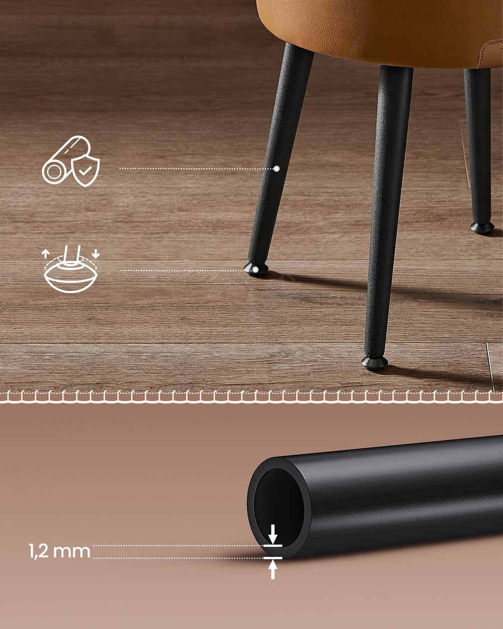 Елегантні сталеві ніжки з регульованими шарнірними підп'ятниками додають сучасного вигляду, витримують до 150 кг та забезпечують стійкість і довговічність.