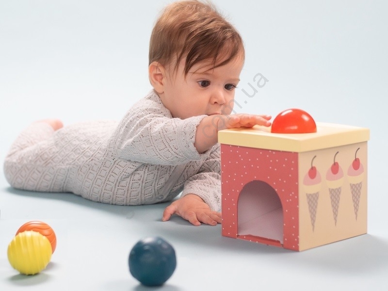 • Під час гри на животику дитина може вставити кульку в отвір в одному з кубиків.