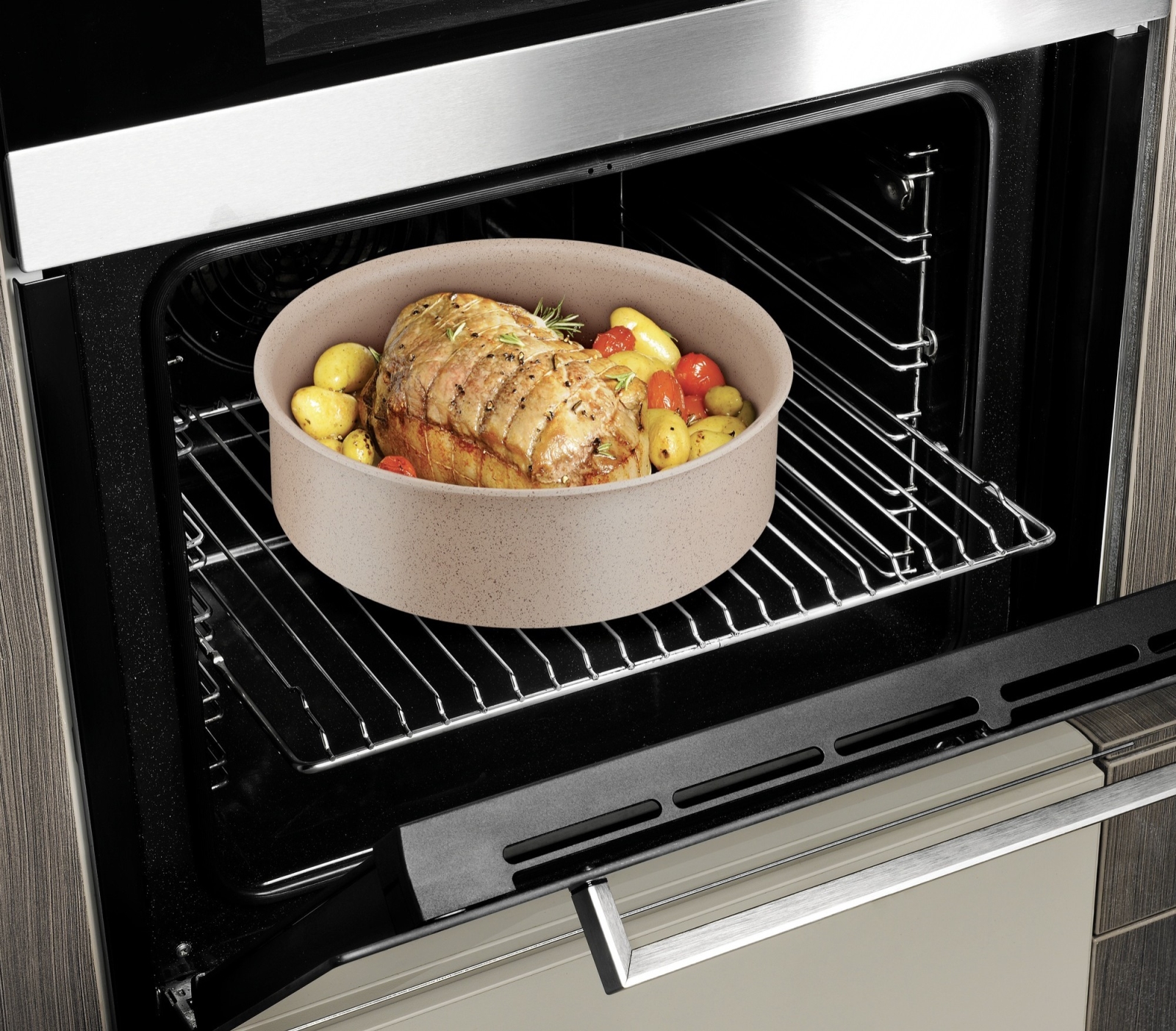 • Конструкція передбачає знімну ручку, яка забезпечує компактне зберігання, можливість використання в духовці та сервірування без ручки.