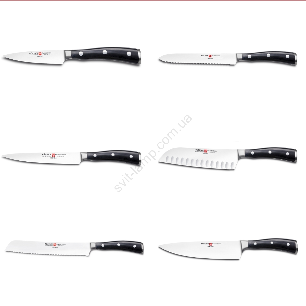 Набір містить: ніж для овочів 9 см, ніж для ковбас 14 см, ніж для шинки 16 см, ніж Santoku 17 см, ніж для хліба 23 см, кухарський ніж 20 см, чорний блок для ножів.